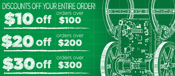 Our Black Friday/Cyber Monday Sale is back with huge discounts on over 1,500 of our top products! The sale runs through Monday, December 1, and the discounts can be used on backorders if we happen to run out of stock, but we encourage you to place your orders early since backorder fulfillment might take longer than usual due to the increased order volume. We hope these deals give all you robot (and other cool stuff) makers out there a happy start to the holiday season!