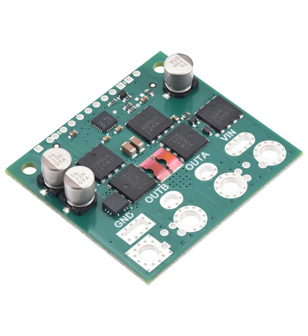This discrete MOSFET H-bridge motor driver enables bidirectional control of one high-power brushed DC motor. The small 1.3″ × 0.8″ board supports a wide 6.5 V to 40 V voltage range and is efficient enough to deliver a continuous 13 A without a heat sink. Additional features of this second-generation (G2) driver include reverse-voltage protection along with basic current sensing and current limiting functionality.