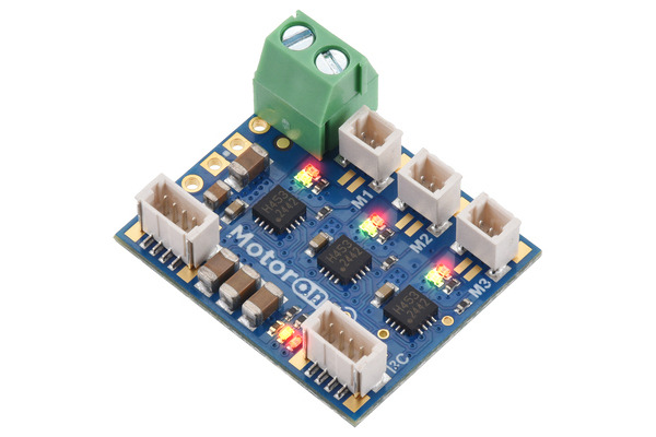 The Motoron M3H550 triple motor controller makes it easy to control DC motors from a Raspberry Pi using I²C. Each stackable module supports motor supply voltages from 1.8 V to 22 V and can independently control up to three motors with continuous output currents up to 1.7 A per channel.