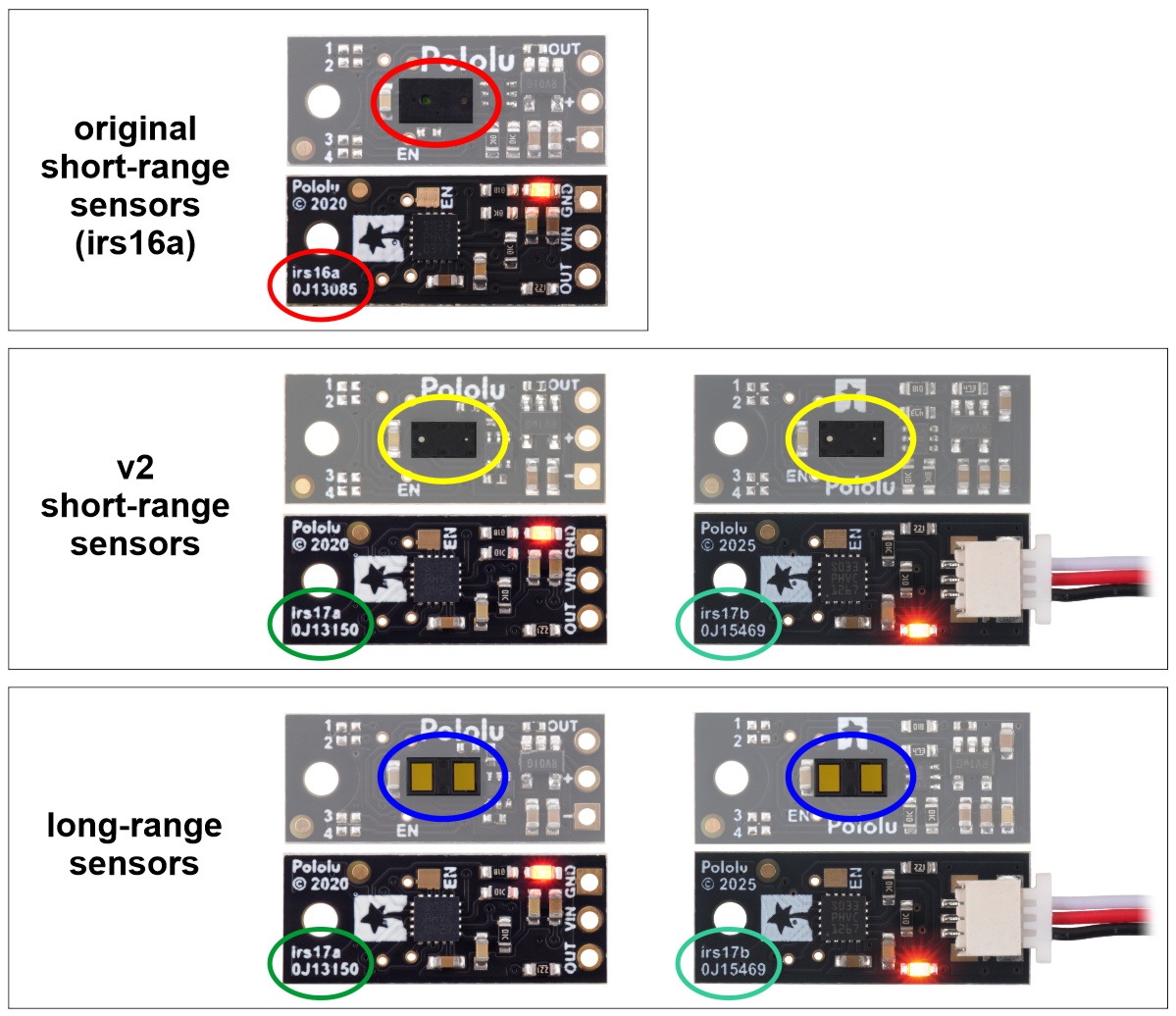 The Pololu Digital Distance Sensor family includes several different sensor types. The jumper options are different for the different sensor types, so it is important to be able to identify which type you have if you want to change the jumper settings. The following diagram shows some key visual differences among the different sensor types: