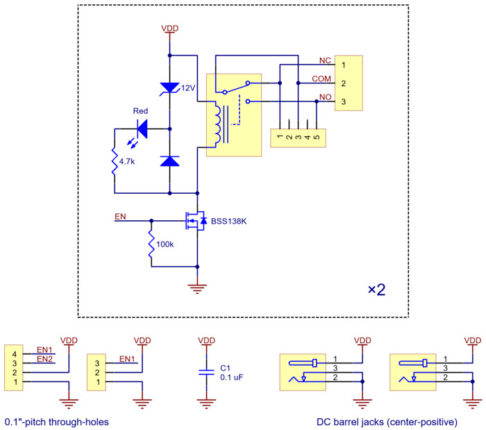 Schematic diagram of the Pololu basic 2-channel SPDT relay carrier with 0.1″ headers. |