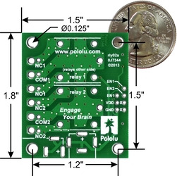 The Pololu basic relay carrier modules make it easy to control electrically isolated, single-pole, double-throw (SPDT) switches from low-voltage, low-current control signals. The modules are available in single-channel and dual-channel versions with 5 V or 12 V power relays—Omron G5LE-14-DC5 and G5LE-14-DC12 (1MB pdf), respectively—and with a variety of connector and assembly options.