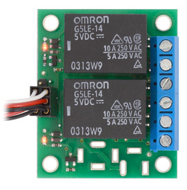 The Pololu basic 2-channel relay carrier modules allow simple, independent control of two single-pole, double-throw (SPDT) switches from low-voltage, low-current control signals. This item includes the basic carrier PCB with two soldered-in 5 V relays, 5mm-pitch terminal blocks for the switch connections, and straight 0.1" male headers for the control connections. The included power relays are Omron G5LE-14-DC5 and are rated for up to 10 A under most conditions.