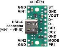 Pinout of the TPS2116 Power Multiplexer Carrier with USB Type-C Connector (USB priority). |