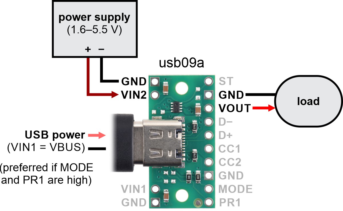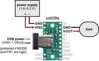 Typical connection diagram for using a TPS2116 power multiplexer carrier (usb09a) with USB as the preferred supply in priority mode. |