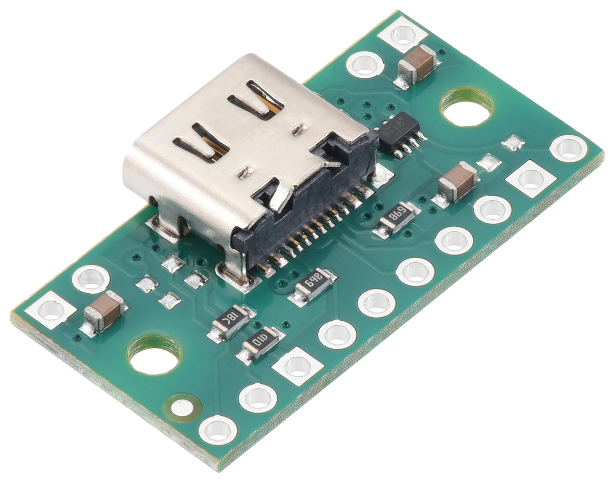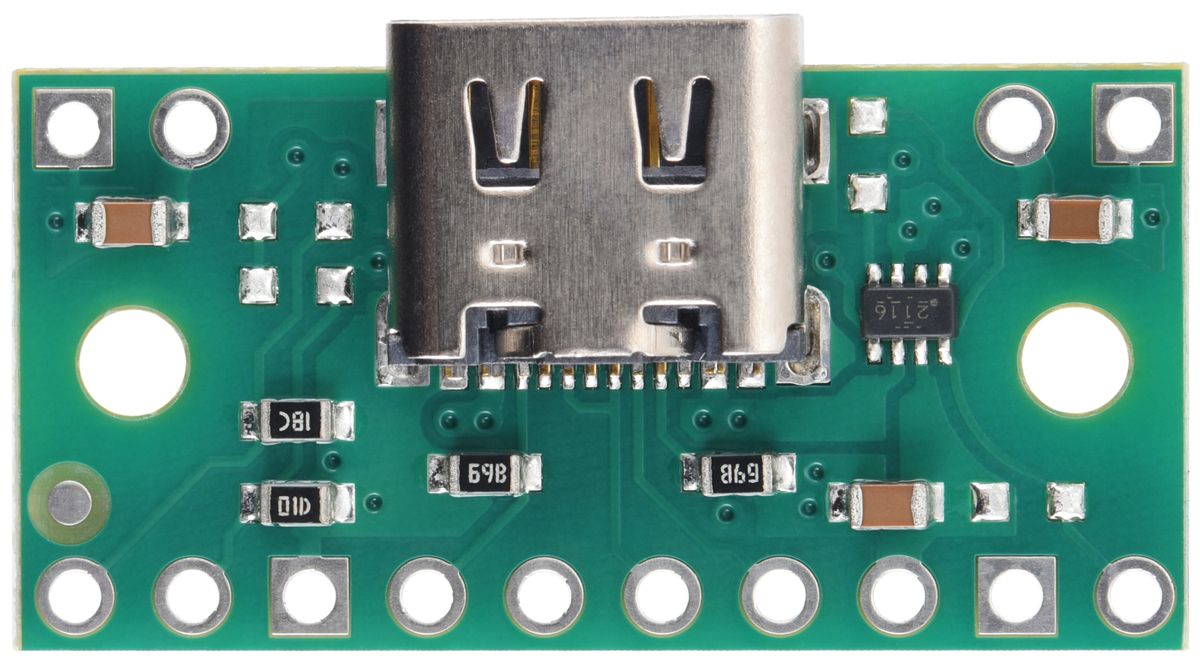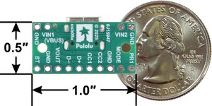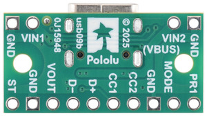 This carrier board for Texas Instruments’s TPS2116 power multiplexer allows seamless switching between two power sources of 1.6 V to 5.5 V with up to 2.5 A of continuous current while blocking reverse current into either source. By default, the mux selects the higher of the two input voltages, and it can also be configured to switch from the VIN1 supply to the VIN2 supply on command or when VIN1 falls below a preset voltage. In addition, this board serves as a breakout for a USB Type-C connector that can be used to supply the non-preferred (VIN2) rail.