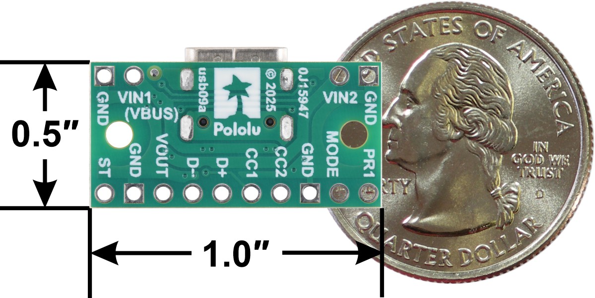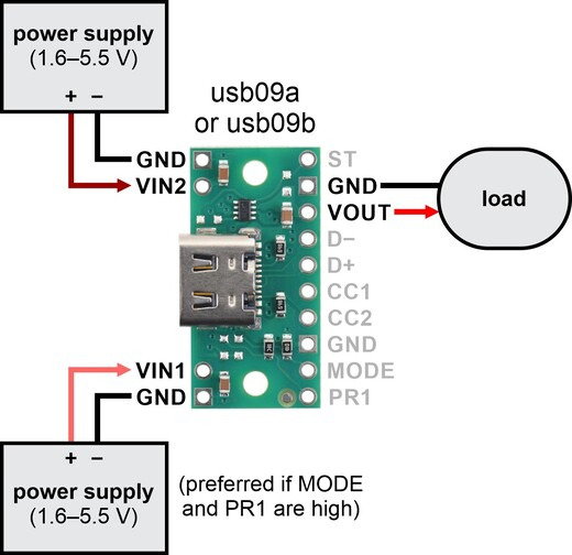 The Type-C USB connector makes it easy to use USB as one of the two power sources. On this board (usb09b), the VBUS line from the USB connector is tied to VIN2. This allows you to power your circuit from either USB or an external power source connected to VIN1, with VIN1 as the preferred power source if MODE and PR1 are high.