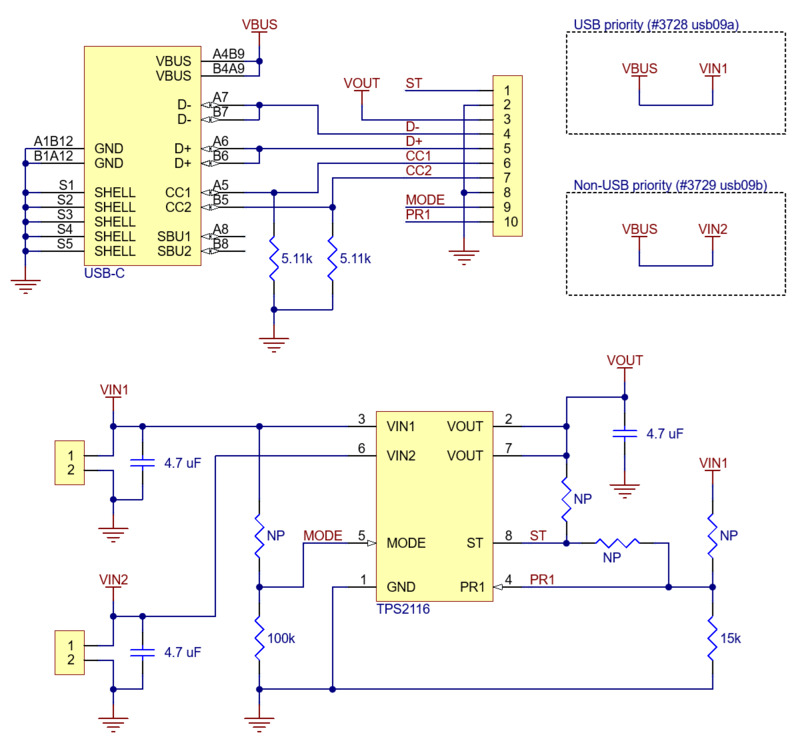 - Item #3728 (usb09a) connects VBUS to VIN1 (the USB power source is preferred in priority mode).