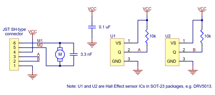 The sensors are powered through the VCC (blue wire) and GND (green wire) pins. VCC can be 2.7 V to 18 V, and the quadrature outputs A and B (yellow and white wires) are digital signals that are either driven low (0 V) by the sensors or pulled to VCC through 10 kΩ pull-up resistors, depending on the applied magnetic field. The sensors’ comparators have built-in hysteresis, which prevents spurious signals in cases where the motor stops near a transition point.