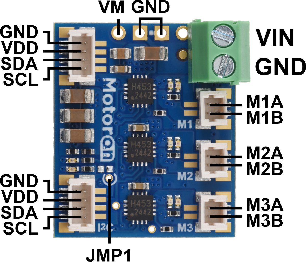 Pinout of the Motoron M3T453 Triple I²C Motor Controller with JST SH-Style Connectors and VIN Terminal Block. |