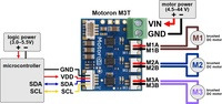 Typical wiring diagram for connecting a microcontroller to a Motoron M3T453 Triple I²C Motor Controller with JST SH-Style Connectors and VIN Terminal Block. |