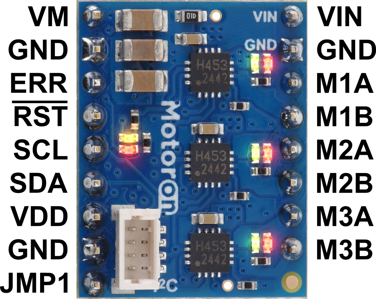 Pinout of the Motoron M3T453 Triple I²C Motor Controller with Soldered Headers. |