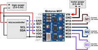 Typical wiring diagram for connecting a microcontroller to a Motoron M3T453 Triple I²C Motor Controller with Soldered Headers. |