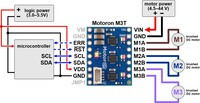 Typical wiring diagram for connecting a microcontroller to a Motoron M3T453 Triple I²C Motor Controller with 0.1″-Pitch Through-Holes. |