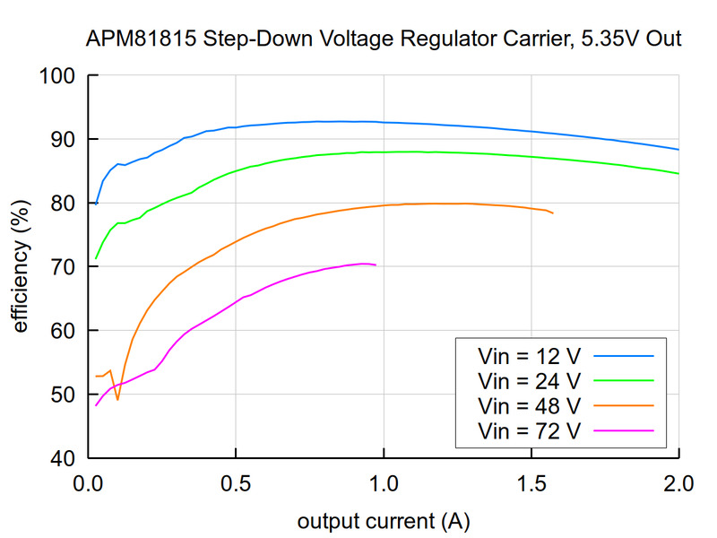 The APM81815 is a synchronous buck (step-down) voltage regulator that generates lower voltages from input voltages as high as 72 V. They are switching regulators (also called switched-mode power supplies (SMPS) or DC-to-DC converters), which makes them much more efficient than linear voltage regulators, especially when the difference between the input and output voltage is large. These regulators can typically support continuous output currents between 0.5 A and 1.5 A, depending on the input voltage and output voltage (see the Maximum continuous output current section below). In general, the available output current decreases as the input voltage increases.