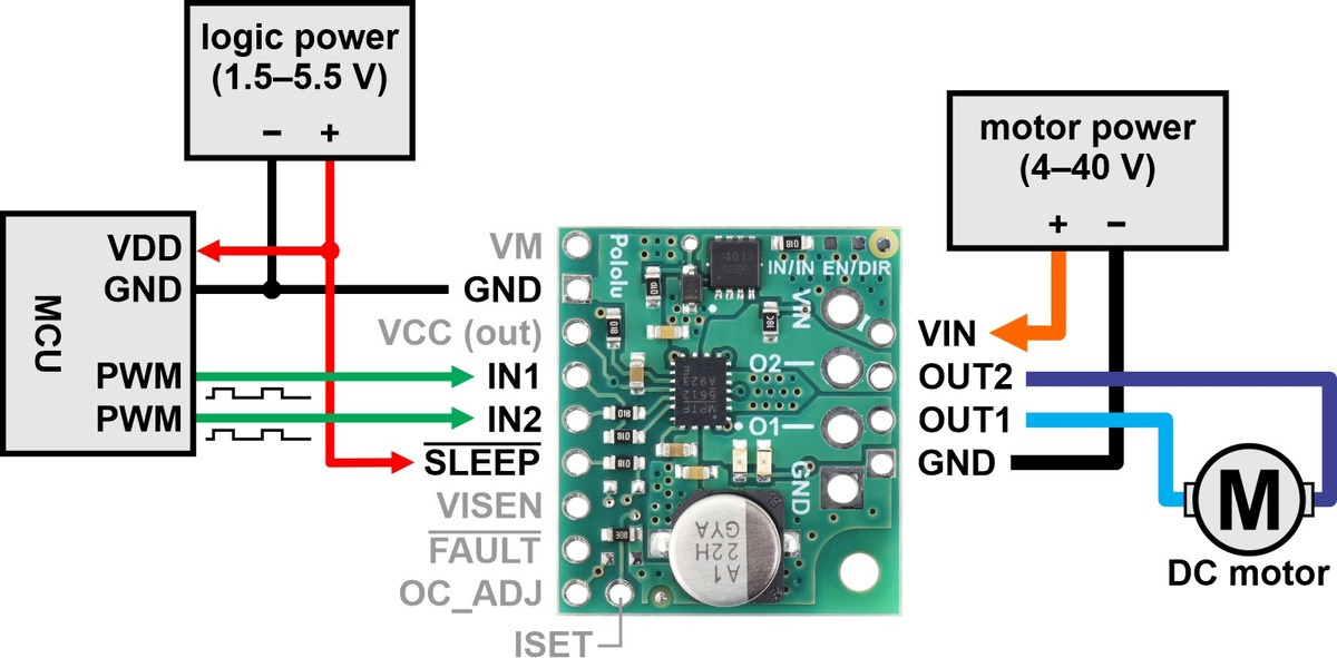Aside from motor and power connections (including a logic voltage connection to SLEEP), the only required control pins are IN1 and IN2. The following simplified truth table shows how these two control pins affect the driver outputs:
