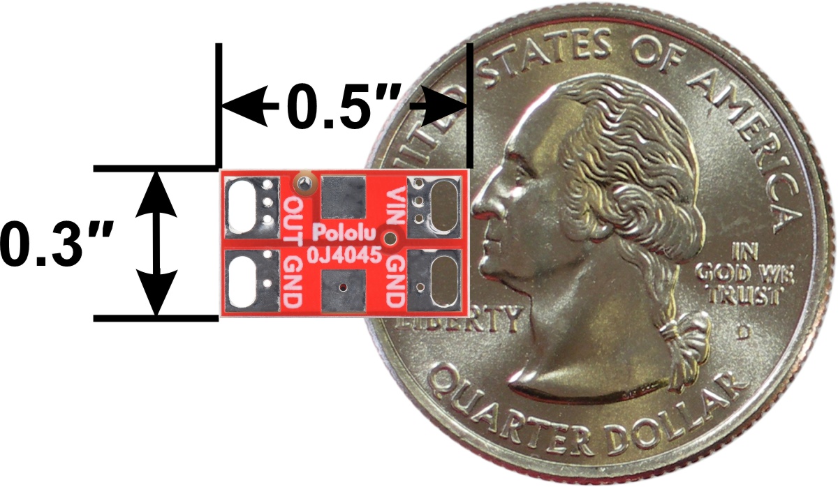 Pololu Reverse Voltage Protector, 4-75V, 8A. bottom view with dimensions and a US quarter for size reference. |