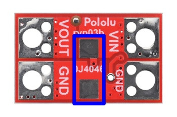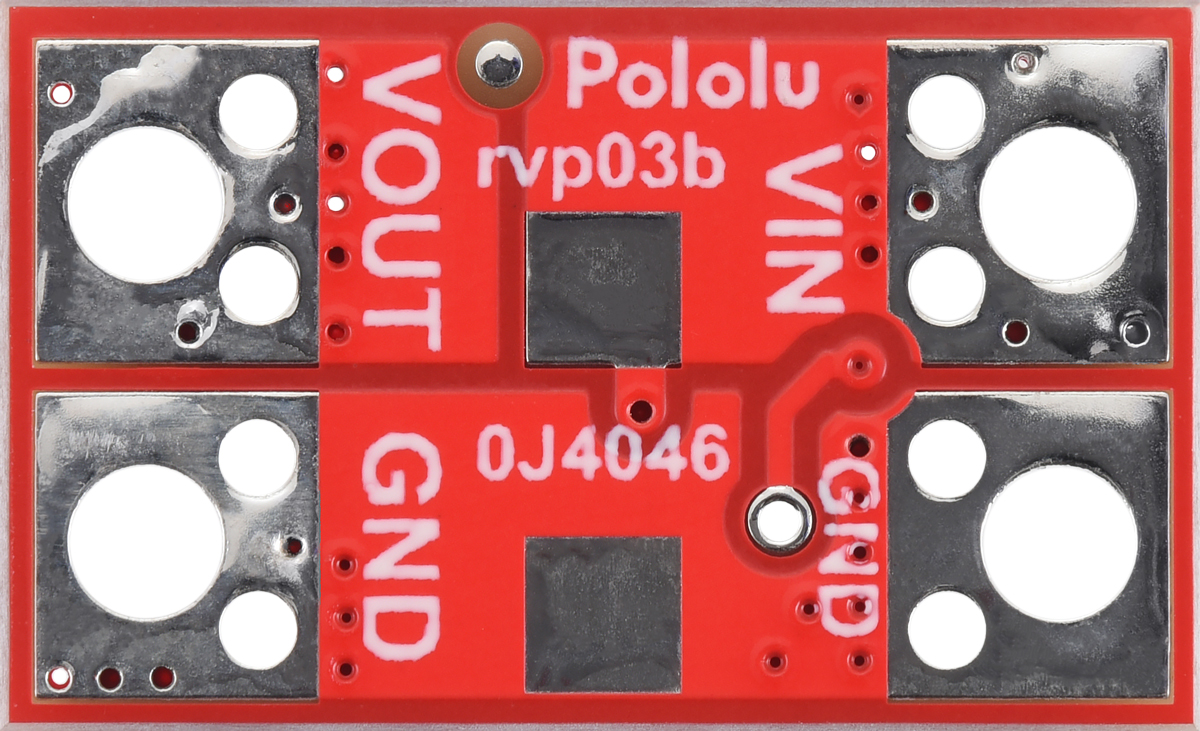The larger input and output through-holes can accommodate 5mm-pitch terminal blocks or up to 14 AWG wires, and the smaller through-holes are spaced for 0.1″-pitch headers. The following pictures show examples with the identically sized 60V-max 20A/25A Pololu reverse voltage protectors, which have green PCBs: