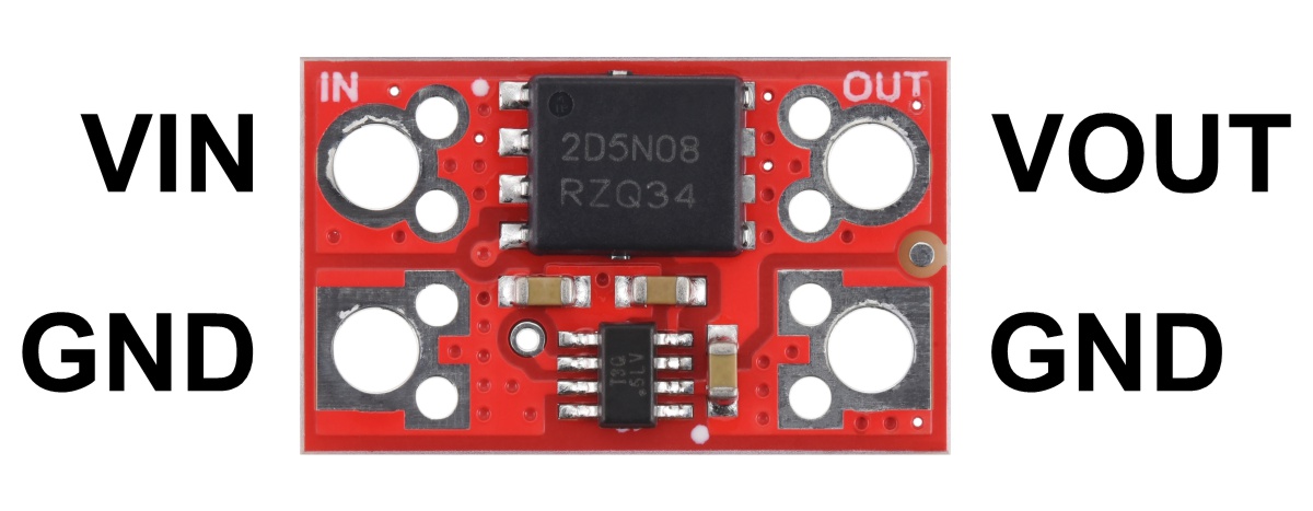 Supply power and ground connect to the VIN and GND side of the board, and the VOUT and GND pins connect to the load. If the supply is connected correctly, with its positive voltage on VIN, the power will pass through the board to VOUT. If the supply is connected incorrectly, with the positive voltage on GND, supply power will not pass through to the output, and any connected load will be protected from the reversed supply voltage.