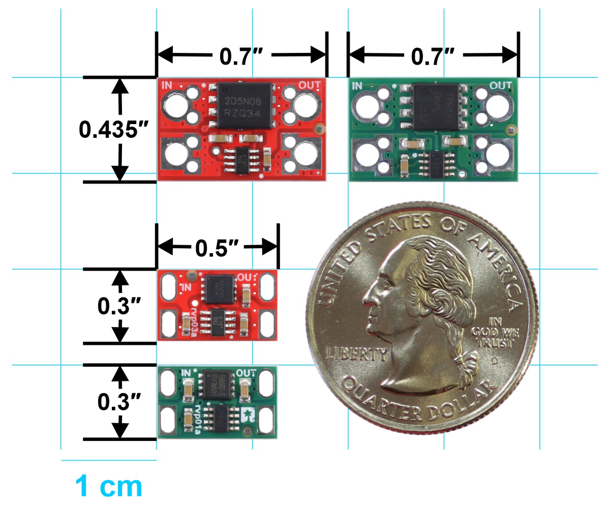 | Operating voltage | Max current | MOSFET on resistance | Reverse current blocking | Size |