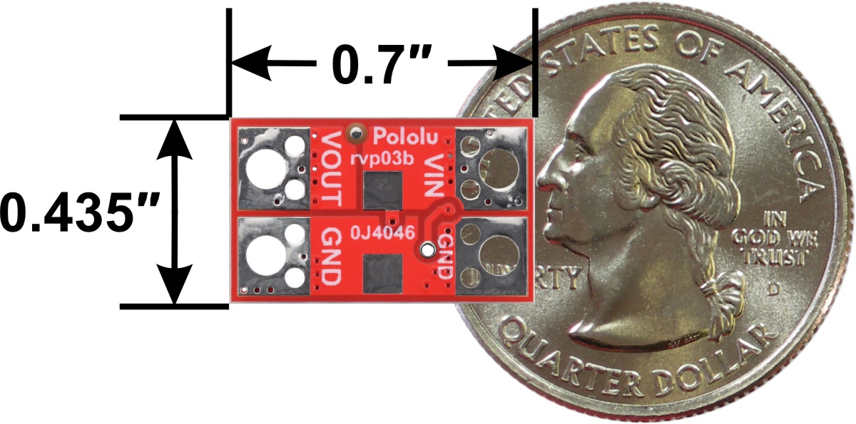 Pololu Reverse Voltage Protector, 4-75V, 17A. bottom view with dimensions and a US quarter for size reference. |
