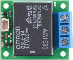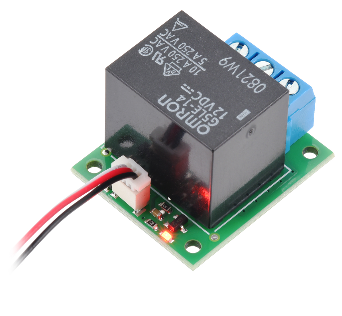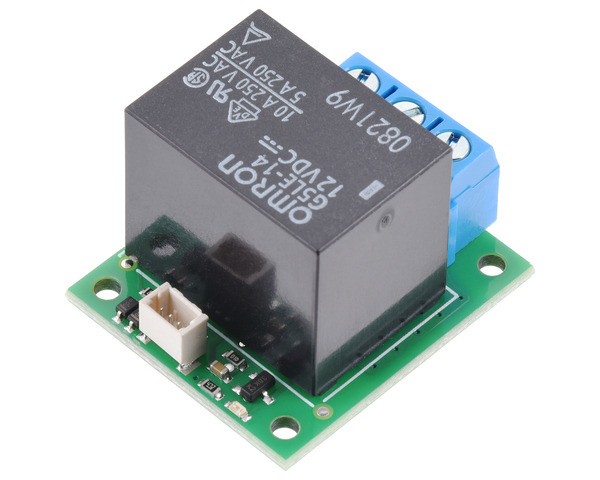 This carrier version is assembled with an Omron G5LE-14-DC12 12 V relay, which is rated for up to 10 A under most conditions, and connectors. It has a soldered 3-pin, 5mm-pitch terminal blocks for the switch connections and a top-entry, 3-pin JST SH-style connector for the control connections. This control connector works with our 3-pin JST SH-style cables (cable not included).