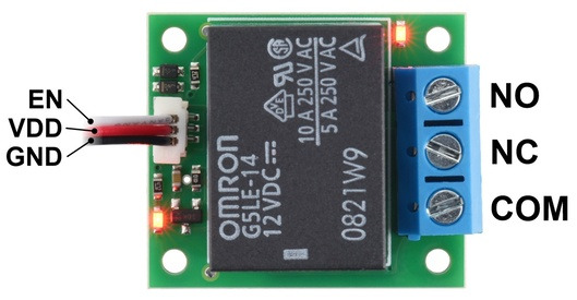 The switch portion of the relay is accessible on one side of the board via the 3-pin terminal block while the control pins (EN, VDD, GND) are routed to the 3-pin JST SH-style connector on other side. The 12 V relay coil is powered by supplying 12 V across the VDD and GND pins, and it is activated by a digital high (2.5 V to 20 V) control signal on the EN pin. The control signal is fed directly to a BSS138K N-channel MOSFET, which in turn actuates the relay coil when the control voltage exceeds approximately 2.5 V, up to a maximum of 20 V (see BSS138K datasheet (517k pdf) for details). Red LEDs on either side of the relay light up when the relay coil is active. The carrier board has four mounting holes that work with #2 or M2 screws.