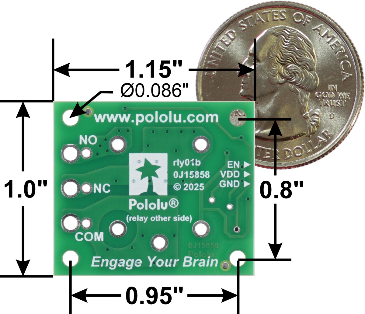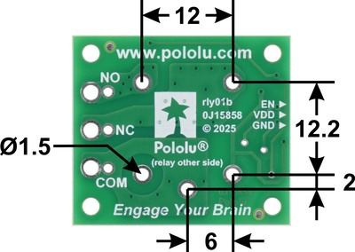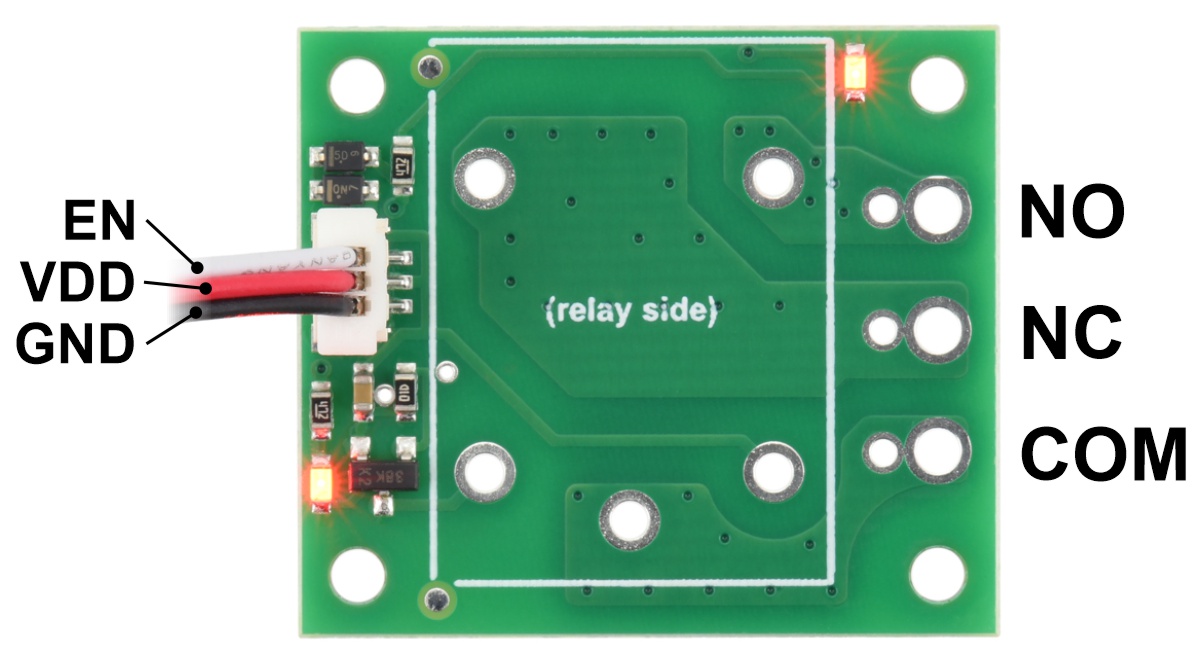 The switch portion of the relay (NO, NC, and COM) is accessible on one side of the board via larger holes that work with 5mm-pitch terminal blocks or smaller holes that work with 0.2″ headers. The control pins (EN, VDD, GND) are routed to the 3-pin JST SH-style connector on other side of the board. The relay coil is powered by supplying the relay’s rated coil voltage across the VDD and GND pins, and it is activated by a digital high (2.5 V to 20 V) control signal on the EN pin. The control signal is fed directly to a BSS138K N-channel MOSFET, which in turn actuates the relay coil when the control voltage exceeds approximately 2.5 V, up to a maximum of 20 V (see BSS138K datasheet (517k pdf) for details). Red LEDs on either side of the relay light up when the relay coil is active. The carrier board has four mounting holes that work with #2 or M2 screws.