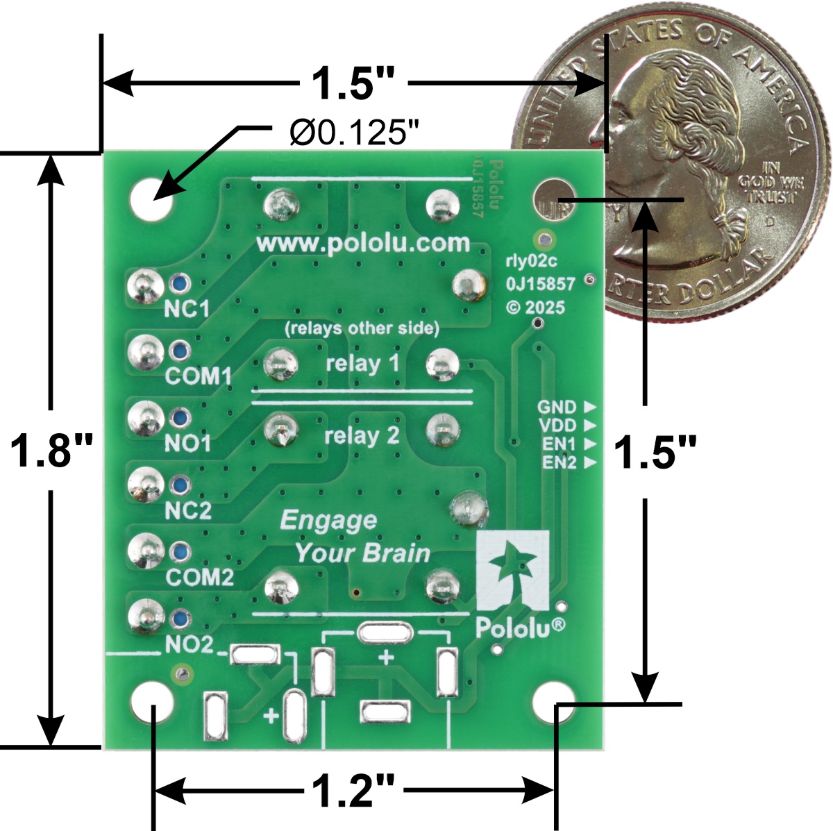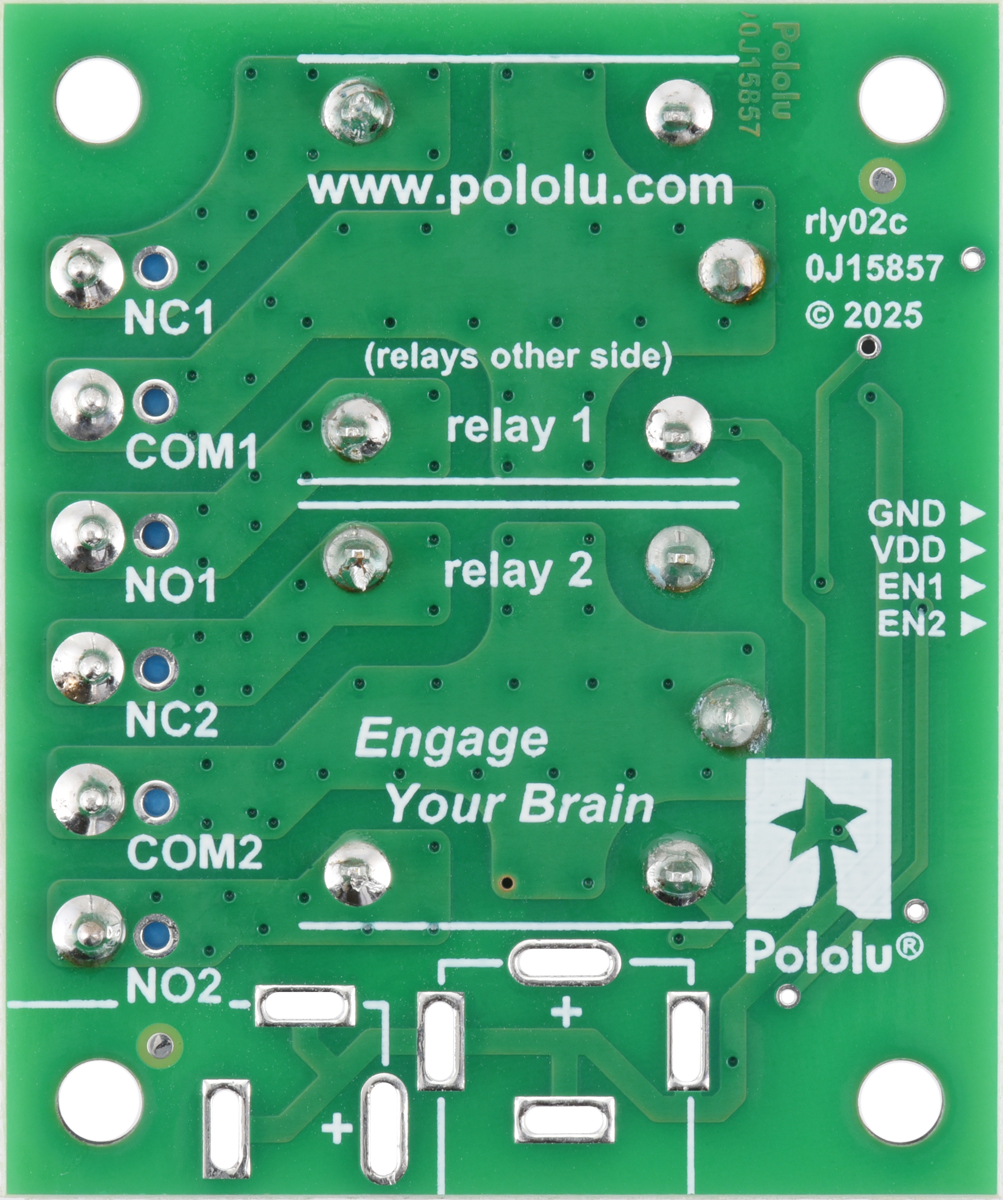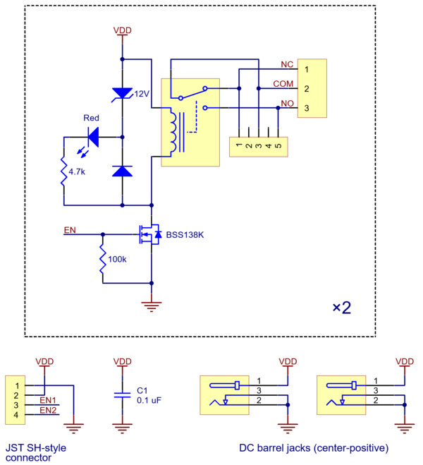 The switch portions of the relays (NCx, COMx, and NOx) are accessible on one side of the board via the 3-pin terminal block while the control pins (GND, VDD, EN1, and EN2) are routed to the 4-pin JST SH-style connector on other side. The 5 V relay coils are powered by supplying 5 V across the VDD and GND pins, and they are activated by digital high (2.5 V to 20 V) control signals on the respective EN pins. The control signals are fed directly to BSS138K N-channel MOSFETs, which in turn actuate the relay coils when the control voltages exceed approximately 2.5 V, up to a maximum of 20 V (see BSS138K datasheet (517k pdf) for details). Each relay has a corresponding red LED that lights up when the relay coil is active. The carrier board has four mounting holes that work with #4 or M3 screws.