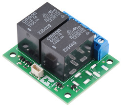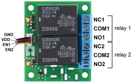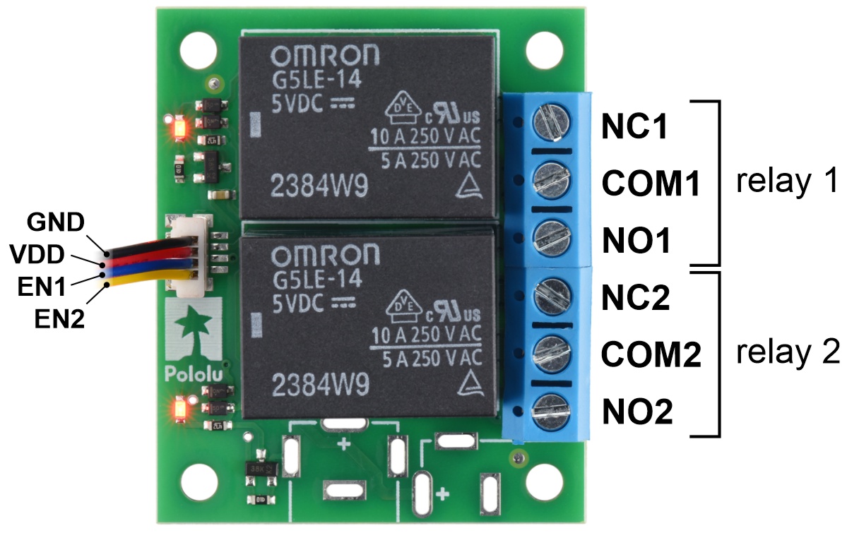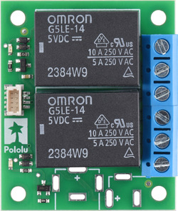 The Pololu basic 2-channel relay carrier modules allow simple, independent control of two single-pole, double-throw (SPDT) switches from low-voltage, low-current control signals. This item includes the basic carrier PCB with two soldered-in 5 V relays, 5mm-pitch terminal blocks for the switch connections, and a top-entry JST SH-style connector for the control connections that works with our selection of 4-pin JST SH-style cables. The included power relays are Omron G5LE-14-DC5 and are rated for up to 10 A under most conditions.