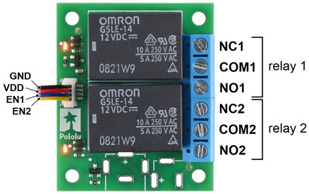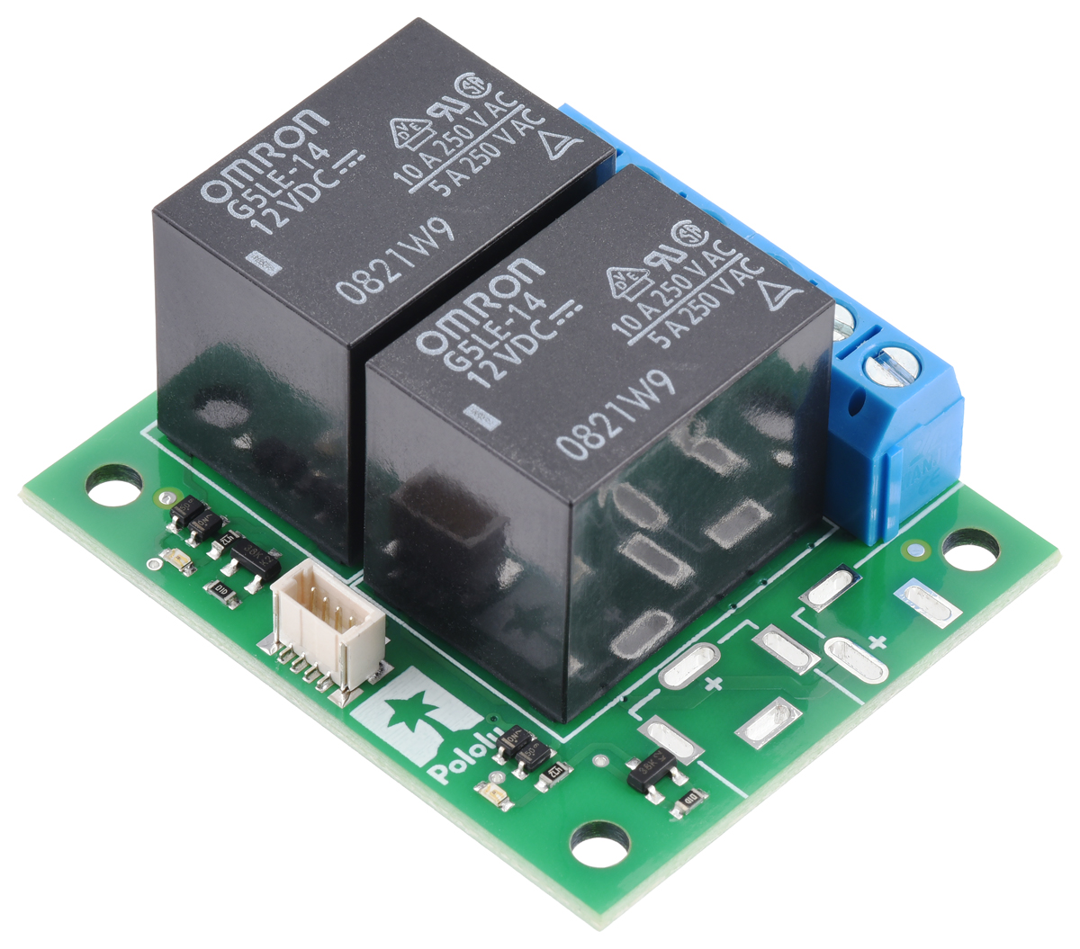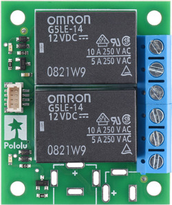 The Pololu basic 2-channel relay carrier modules allow simple, independent control of two single-pole, double-throw (SPDT) switches from low-voltage, low-current control signals. This item includes the basic carrier PCB with two soldered-in 12 V relays, 5mm-pitch terminal blocks for the switch connections, and a top-entry JST SH-style connector for the control connections that works with our selection of 4-pin JST SH-style cables. The included power relays are Omron G5LE-14-DC12 and are rated for up to 10 A under most conditions.