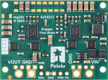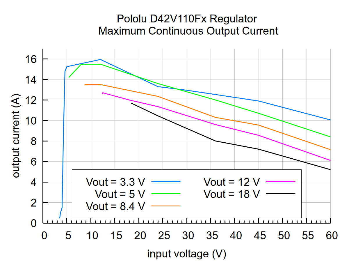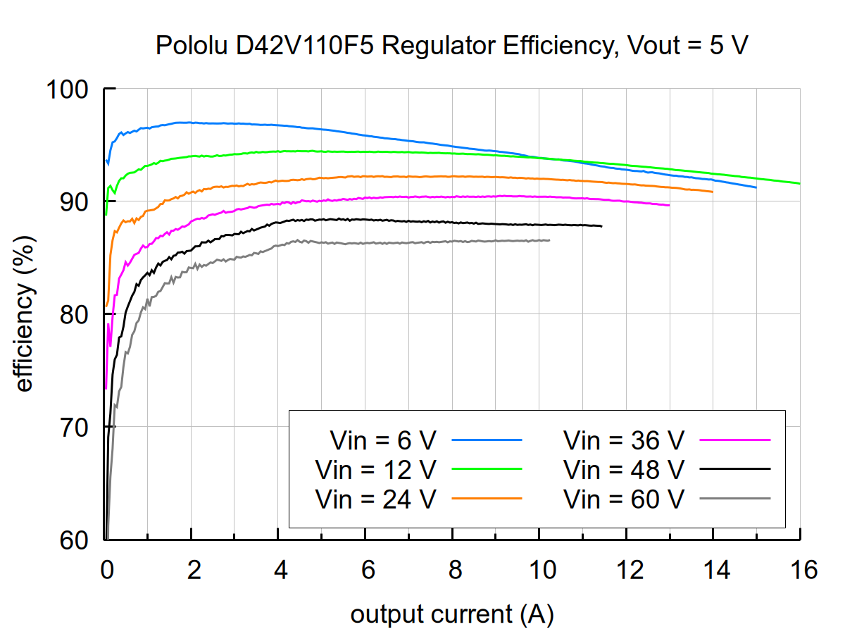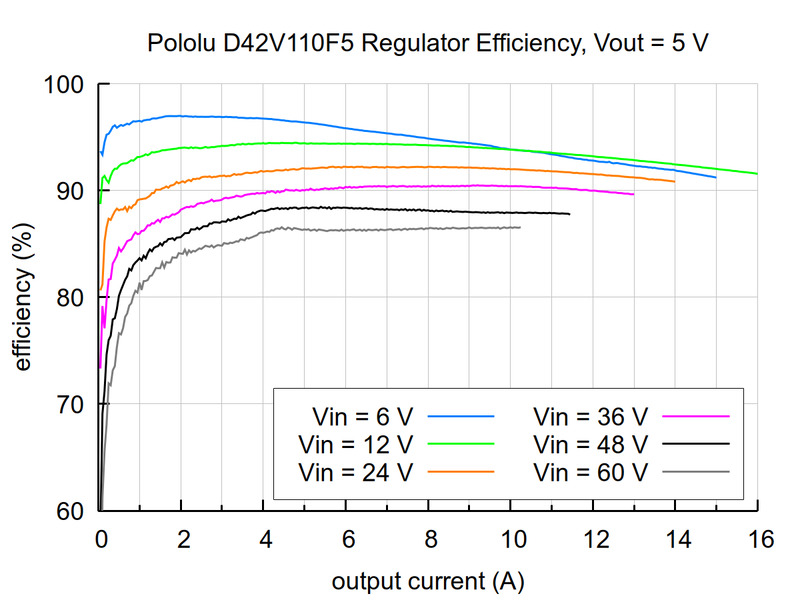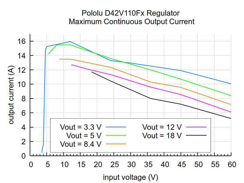 The D42V110Fx family of synchronous buck (step-down) voltage regulators generates lower output voltages from input voltages as high as 60 V. They are switching regulators (also called switched-mode power supplies (SMPS) or DC-to-DC converters), which makes them much more efficient than linear voltage regulators, especially when the difference between the input and output voltage is large. These regulators can typically support continuous output currents between 6 A and 16 A, depending on the input voltage and output voltage (see the Maximum continuous output current section below). In general, the available output current is higher for the lower-voltage versions than it is for the higher-voltage versions, and it decreases as the input voltage increases.