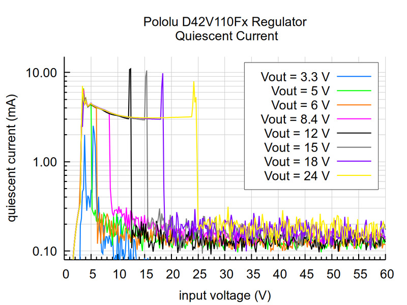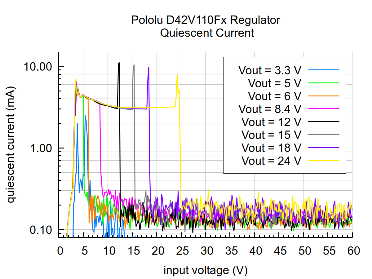 The quiescent current is the current the regulator uses just to power itself, and the graph below shows this for the different regulator versions as a function of the input voltage. The module’s ENA input can be driven low to put the board into a low-power state where it draws approximately 100 µA plus 2 µA per volt on VIN (note that for high input voltages, this current draw can exceed the quiescent current draw of the regulator).