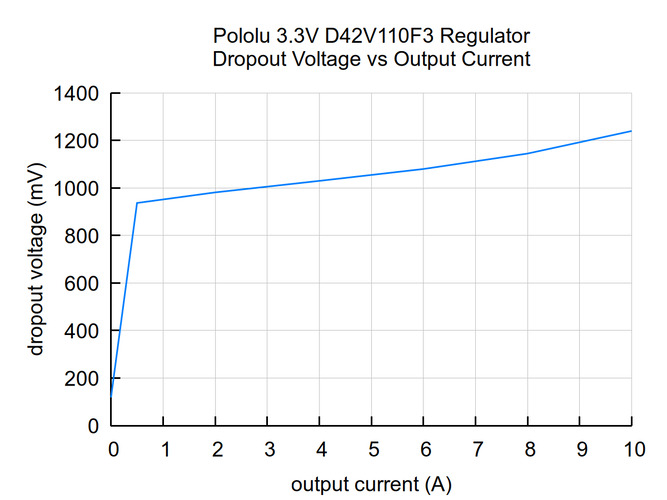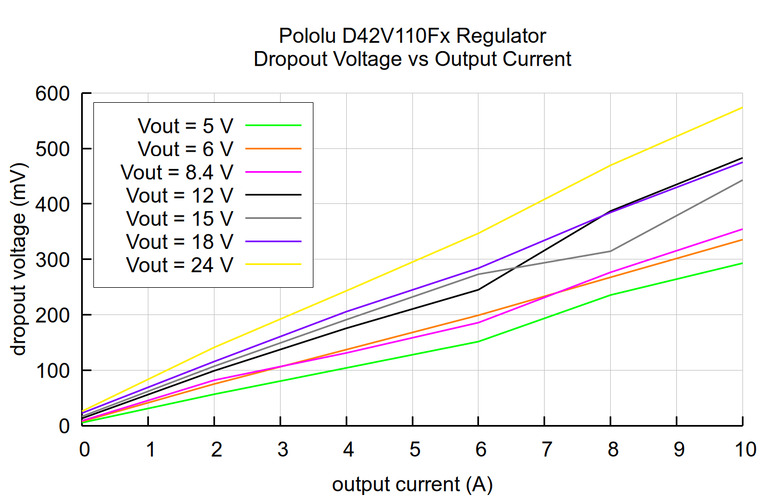The dropout voltage of a step-down regulator is the minimum amount by which the input voltage must exceed the regulator’s target output voltage in order to ensure the target output can be achieved. For example, if a 5 V regulator has a 1 V dropout voltage, the input must be at least 6 V to ensure the output is the full 5 V. Generally speaking, the dropout voltage increases as the output current increases. The two graphs below shows the dropout voltages for this family (the 3.3 V version has its own separate graph because its dropout voltage curve is very different from the other members of this family):