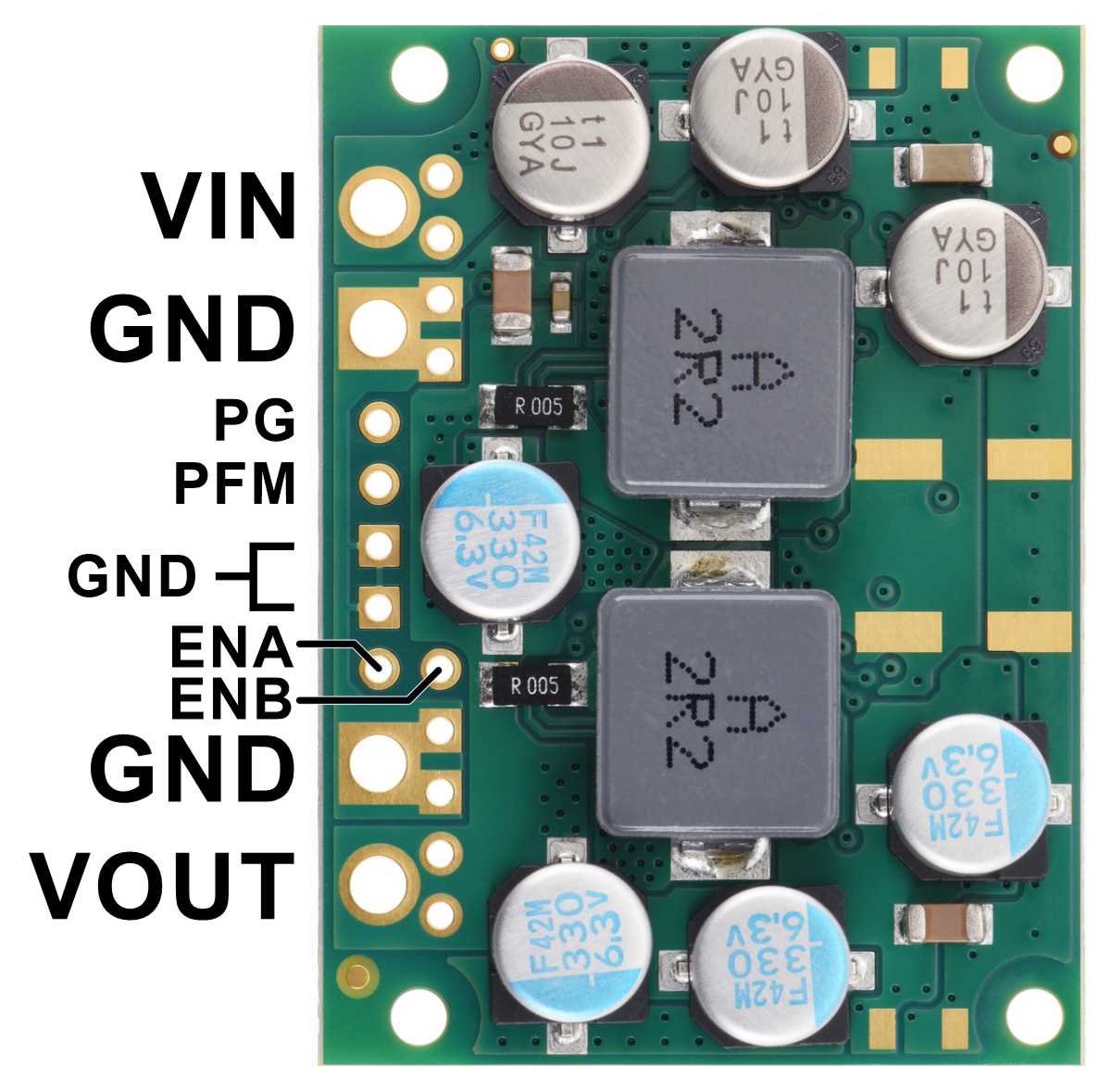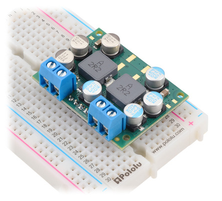The board offers several options for making electrical connections. The three sets of smaller through-holes are arranged with a 0.1″ spacing for compatibility with solderless breadboards and 0.1″-pitch headers. The pairs of larger holes for VIN, VOUT, and GND are sized to accommodate 14 AWG wires or 2-pin 5mm-pitch terminal blocks.