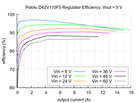 Note 1: At 42 V in. Actual achievable continuous output current is a function of input voltage and is limited by thermal dissipation. See the output current graphs on the product pages for more information.
