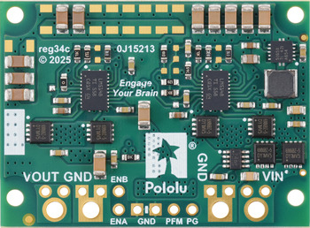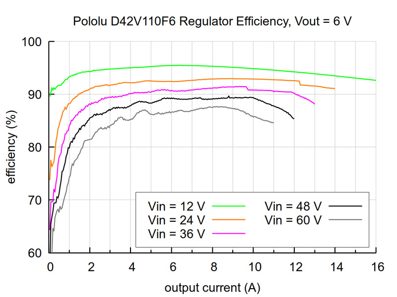 The D42V110Fx family of synchronous buck (step-down) voltage regulators generates lower output voltages from input voltages as high as 60 V. They are switching regulators (also called switched-mode power supplies (SMPS) or DC-to-DC converters), which makes them much more efficient than linear voltage regulators, especially when the difference between the input and output voltage is large. These regulators can typically support continuous output currents between 6 A and 16 A, depending on the input voltage and output voltage (see the Maximum continuous output current section below). In general, the available output current is higher for the lower-voltage versions than it is for the higher-voltage versions, and it decreases as the input voltage increases.