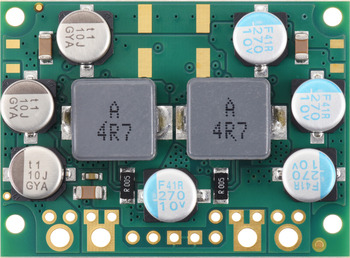 The D42V110Fx family of synchronous buck (step-down) voltage regulators generates lower output voltages from input voltages as high as 60 V. They are switching regulators (also called switched-mode power supplies (SMPS) or DC-to-DC converters), which makes them much more efficient than linear voltage regulators, especially when the difference between the input and output voltage is large. These regulators can typically support continuous output currents between 6 A and 16 A, depending on the input voltage and output voltage (see the Maximum continuous output current section below). In general, the available output current is higher for the lower-voltage versions than it is for the higher-voltage versions, and it decreases as the input voltage increases.