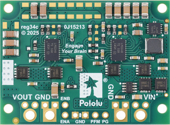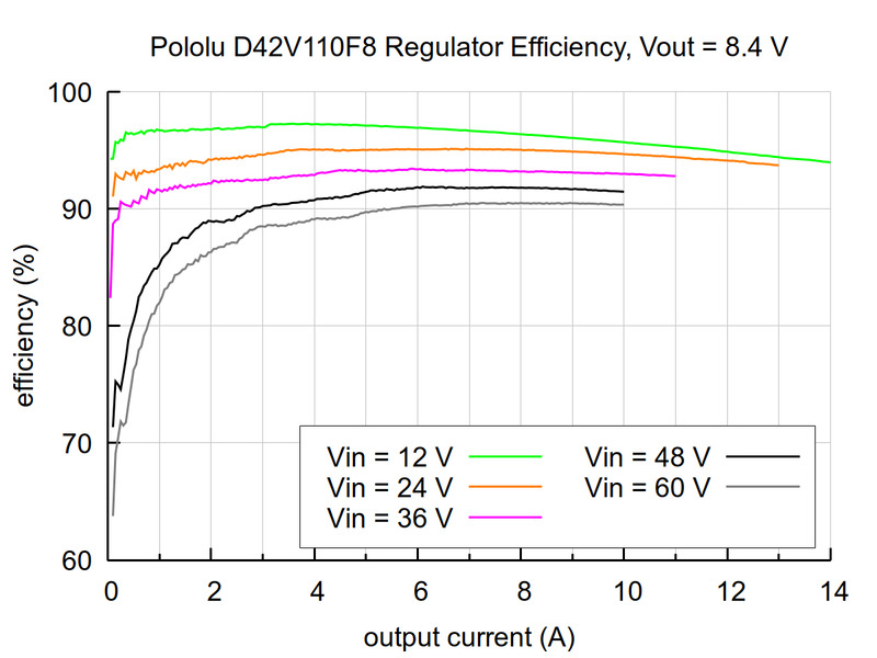 The D42V110Fx family of synchronous buck (step-down) voltage regulators generates lower output voltages from input voltages as high as 60 V. They are switching regulators (also called switched-mode power supplies (SMPS) or DC-to-DC converters), which makes them much more efficient than linear voltage regulators, especially when the difference between the input and output voltage is large. These regulators can typically support continuous output currents between 6 A and 16 A, depending on the input voltage and output voltage (see the Maximum continuous output current section below). In general, the available output current is higher for the lower-voltage versions than it is for the higher-voltage versions, and it decreases as the input voltage increases.