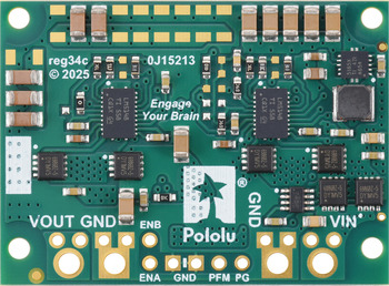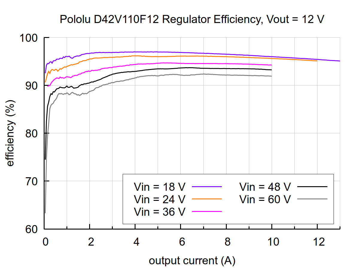 The D42V110Fx family of synchronous buck (step-down) voltage regulators generates lower output voltages from input voltages as high as 60 V. They are switching regulators (also called switched-mode power supplies (SMPS) or DC-to-DC converters), which makes them much more efficient than linear voltage regulators, especially when the difference between the input and output voltage is large. These regulators can typically support continuous output currents between 6 A and 16 A, depending on the input voltage and output voltage (see the Maximum continuous output current section below). In general, the available output current is higher for the lower-voltage versions than it is for the higher-voltage versions, and it decreases as the input voltage increases.
