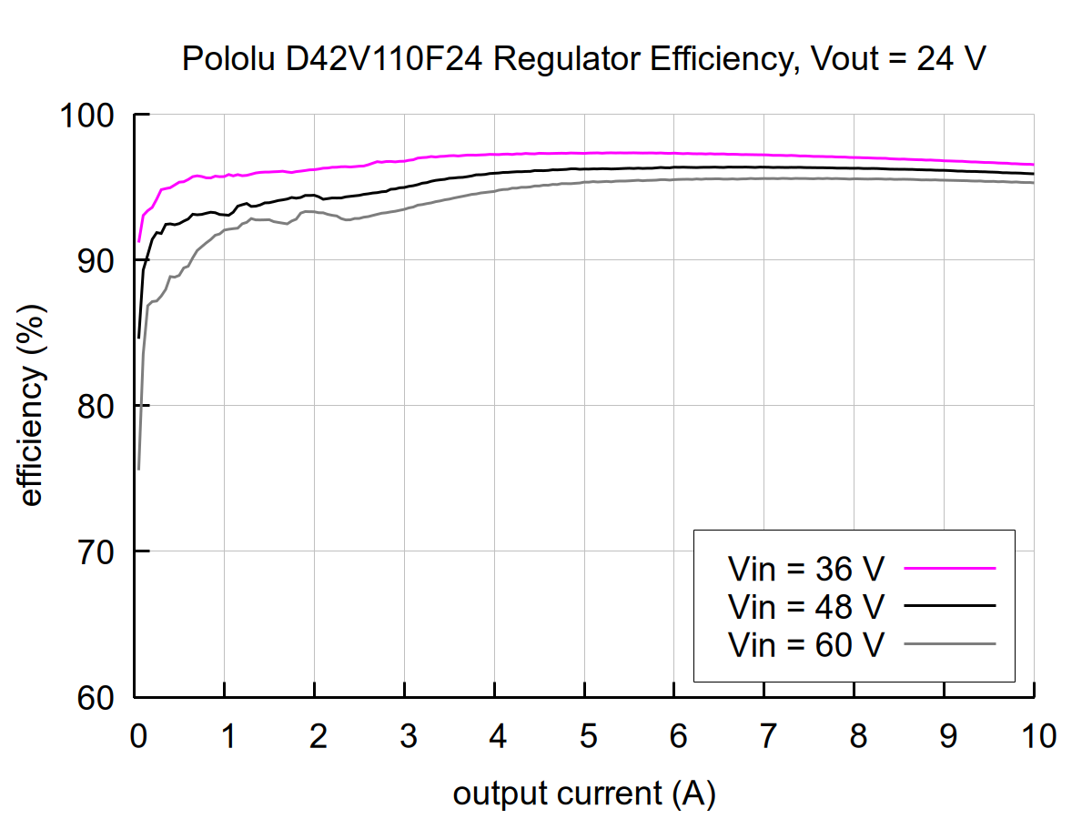 The D42V110Fx family of synchronous buck (step-down) voltage regulators generates lower output voltages from input voltages as high as 60 V. They are switching regulators (also called switched-mode power supplies (SMPS) or DC-to-DC converters), which makes them much more efficient than linear voltage regulators, especially when the difference between the input and output voltage is large. These regulators can typically support continuous output currents between 6 A and 16 A, depending on the input voltage and output voltage (see the Maximum continuous output current section below). In general, the available output current is higher for the lower-voltage versions than it is for the higher-voltage versions, and it decreases as the input voltage increases.