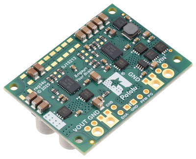 The board offers several options for making electrical connections. The three sets of smaller through-holes are arranged with a 0.1″ spacing for compatibility with solderless breadboards and 0.1″-pitch headers. The pairs of larger holes for VIN, VOUT, and GND are sized to accommodate 14 AWG wires or 2-pin 5mm-pitch terminal blocks.