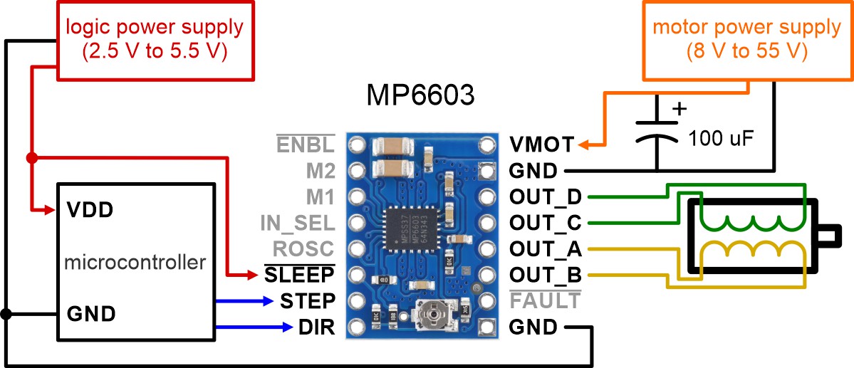 Minimal wiring diagram for connecting a microcontroller to an MP6603 Stepper Motor Driver Carrier (full-step mode). |