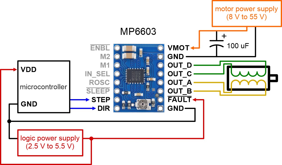 Alternative minimal wiring diagram for connecting a microcontroller to an MP6603 Stepper Motor Driver Carrier (full-step mode). |