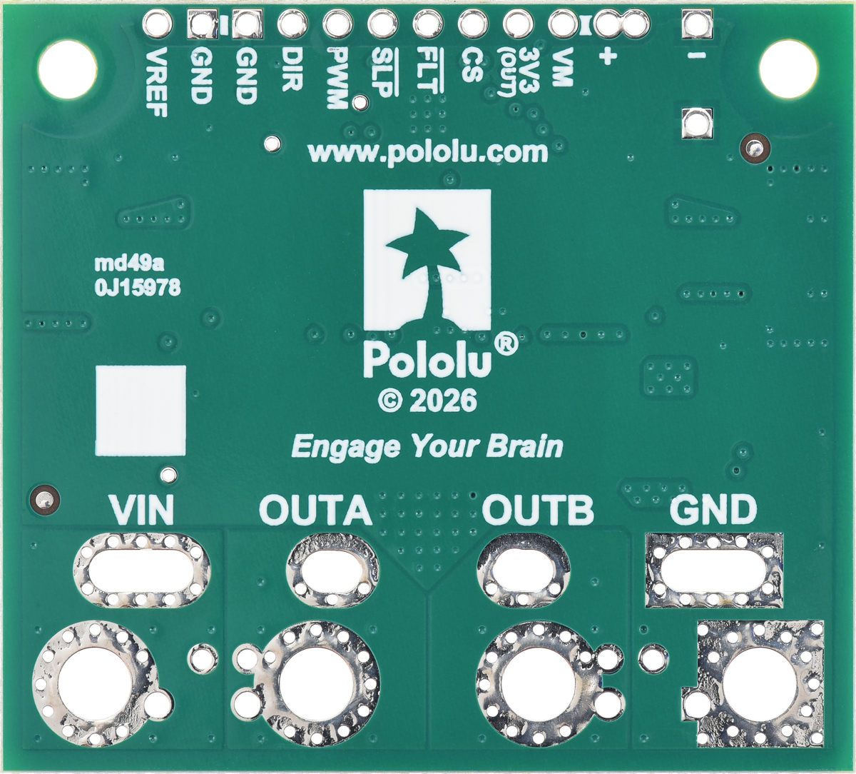 Pololu G2 High-Power Motor Driver 24v30 CS, bottom view. |