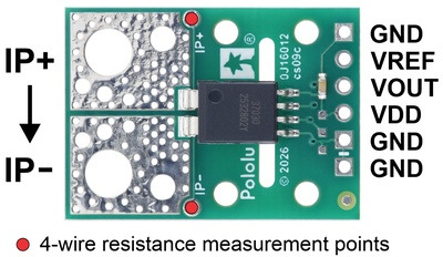 The carrier board also includes two optional connection points, marked in red in the picture above, for taking a 4-wire measurement of the IC current path resistance. This is to more conveniently evaluate that property of the chip and is not required for normal use of this product as a current sensor.