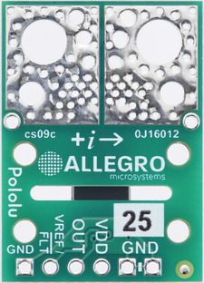 This compact carrier features the ACS37030LMYATR-025B3, which is intended for nominal 3.3 V operation and is designed for bidirectional input current from -25 A to +25 A. This version can be visually distinguished from the other versions by the “25” printed on the bottom side, as shown in the left picture above.